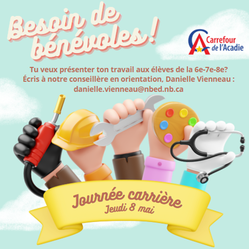 Le jeudi 8 mai en avant-midi, nous organisons une Journée carrière à l’école et nous aimerions inviter des parents et des gens de la communauté à venir parler de leur emploi aux élèves.