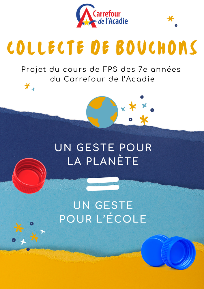 Nous effectuons une collecte de bouchons de plastique pour les cours de FPS 7e année. Nous aimerions amasser le plus de bouchons de plastique possibles (couleurs et grandeurs variées).