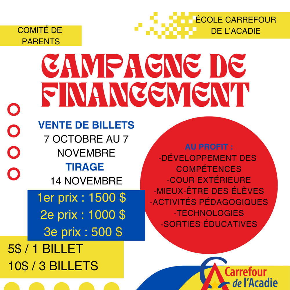 Le comité de parents de l’école Carrefour de l’Acadie lance officiellement leur nouvelle campagne de financement pour l’année scolaire 2023-2024 dès aujourd’hui! Nous sommes fiers de vous annoncer que notre loterie sera notre campagne de financement majeure pour notre école.