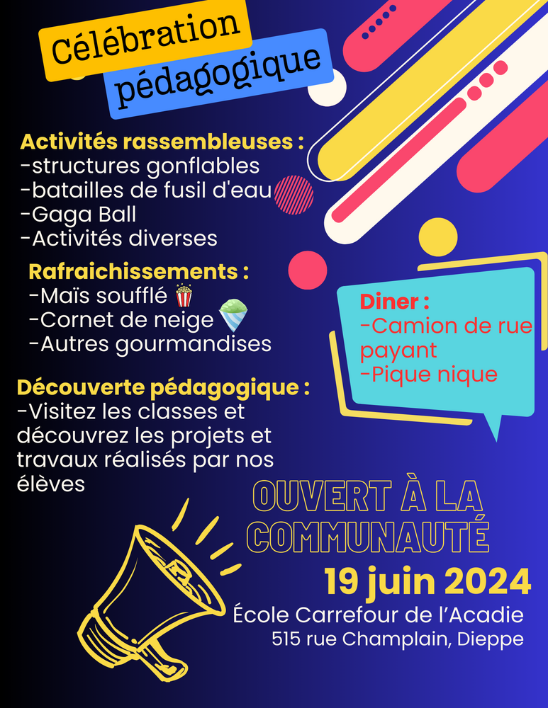 Nous avons le plaisir de vous inviter à la célébration pédagogique de l'école Carrefour de l'Acadie qui se tiendra le 19 juin. Cet événement spécial, ouvert à toute la communauté, mettra en lumière le travail exceptionnel de nos élèves et de nos enseignants tout en offrant une journée riche en activités.