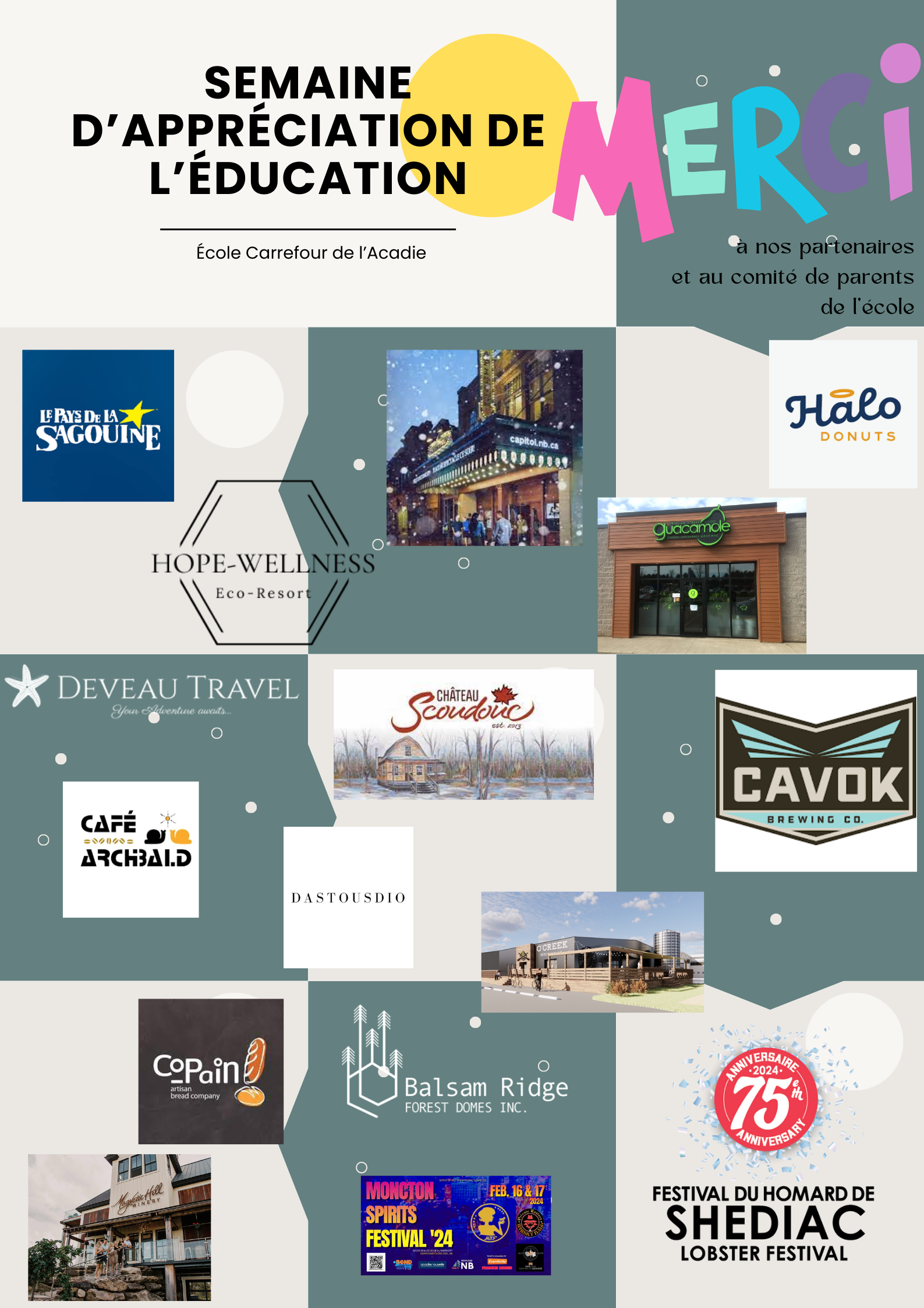 Lors de la semaine du 12 au 16 février 2024, l'équipe de direction et le comité de parents souhaitaient profiter de l’occasion pour souligner notre appréciation et notre gratitude envers toutes les personnes qui gravitent autour de nos élèves et qui constituent des membres indispensables de la belle équipe de l’école Carrefour de l’Acadie.